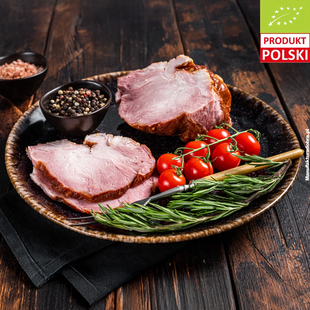 EKO Karczek wędzony i parzony ze Świni Pastwiskowej – soczysty, aromatyczny karczek premium z ekologicznej hodowli świń, peklowany, tradycyjnie wędzony i parzony.