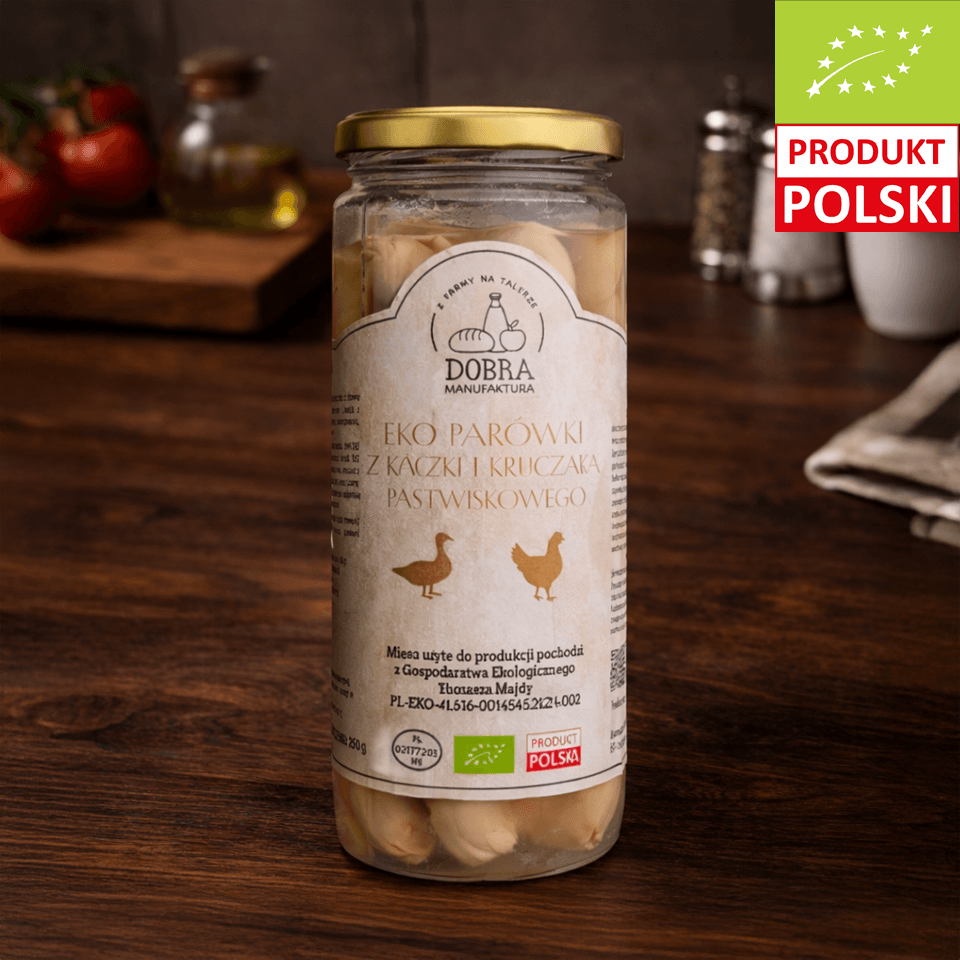 Delikatne, pełne smaku i w 100% naturalne – EKO Parówki z Kaczki i Kurczaka Pastwiskowego to nowoczesna odpowiedź na klasyczną przekąskę. Bez konserwantów, fosforanów czy sztucznych barwników. Uzupełnione jedynie naturalnymi przyprawami i ekstraktami roślinnymi, dzięki czemu zachowują swój złocisty kolor i świeży aromat.