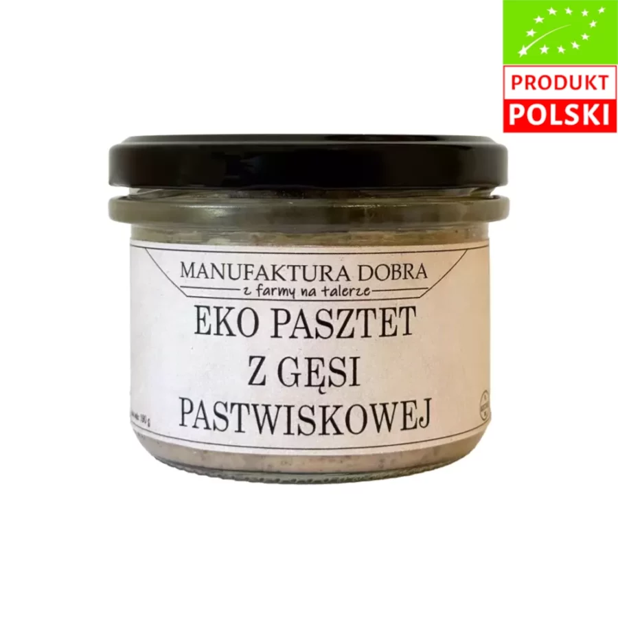 EKO Pasztet z gęsi pastwiskowej powstaje z mięsa gęsi kołudzkiej hodowanej w naszym certyfikowanym gospodarstwie ekologicznym. Nasze ptaki pasą się na pastwiskach, gdzie mają swobodny dostęp do świeżej trawy i czystej wody. Do przygotowania drobiowego pasztetu z gęsiny używamy wyłącznie ekologicznego mięsa gęsi, wątróbki gęsiej oraz niewielkiej ilości tłuszczu gęsiego. Smak staropolskiego pasztetu z gęsiny podkreślają naturalne przyprawy. To prawdziwy pasztet gęsi bez konserwantów i sztucznych dodatków, którego smak wynika z jakości składników. Świetnie sprawdza się na kromce świeżego chleba albo jako składnik deski wędlin.