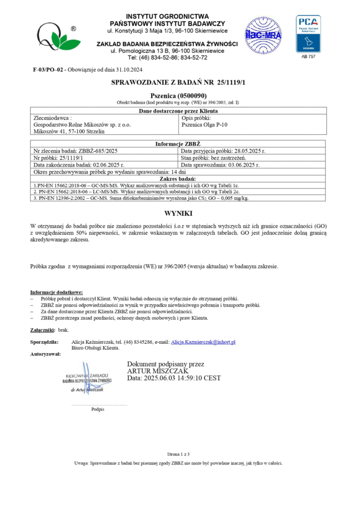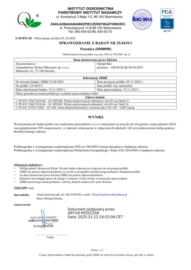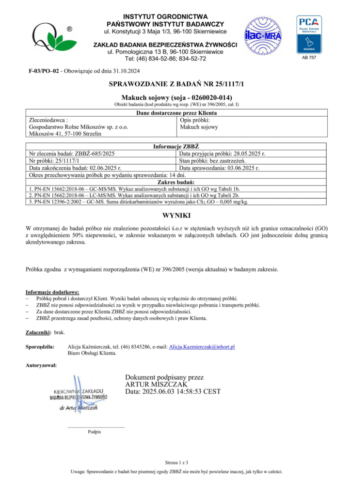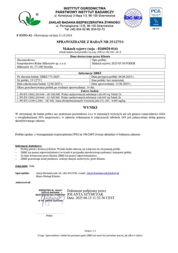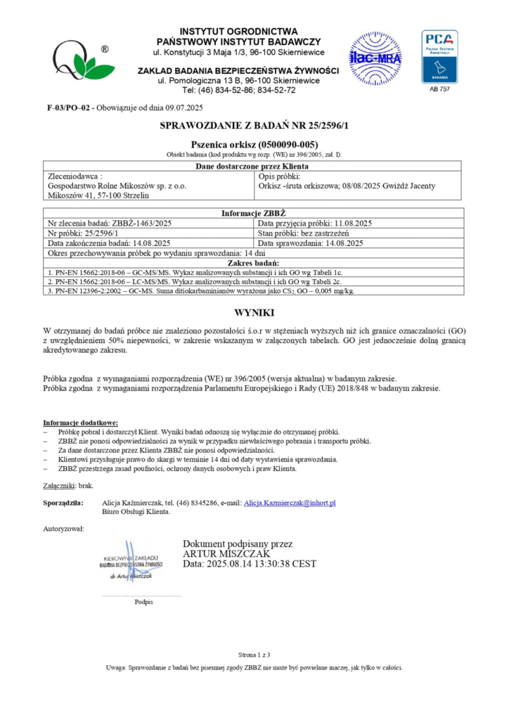 Próbkę z każdej partii zboża wysyłamy do akredytowanego laboratorium, które analizuje zboże pod kątem zawartości ponad 500 substancji niedozwolonych w rolnictwie ekologicznym. Dzięki temu mamy pewność, że nasza mieszanka zbożowa jest wolna od chemii, a mięso – naprawdę ekologiczne, zdrowe i bezpieczne.